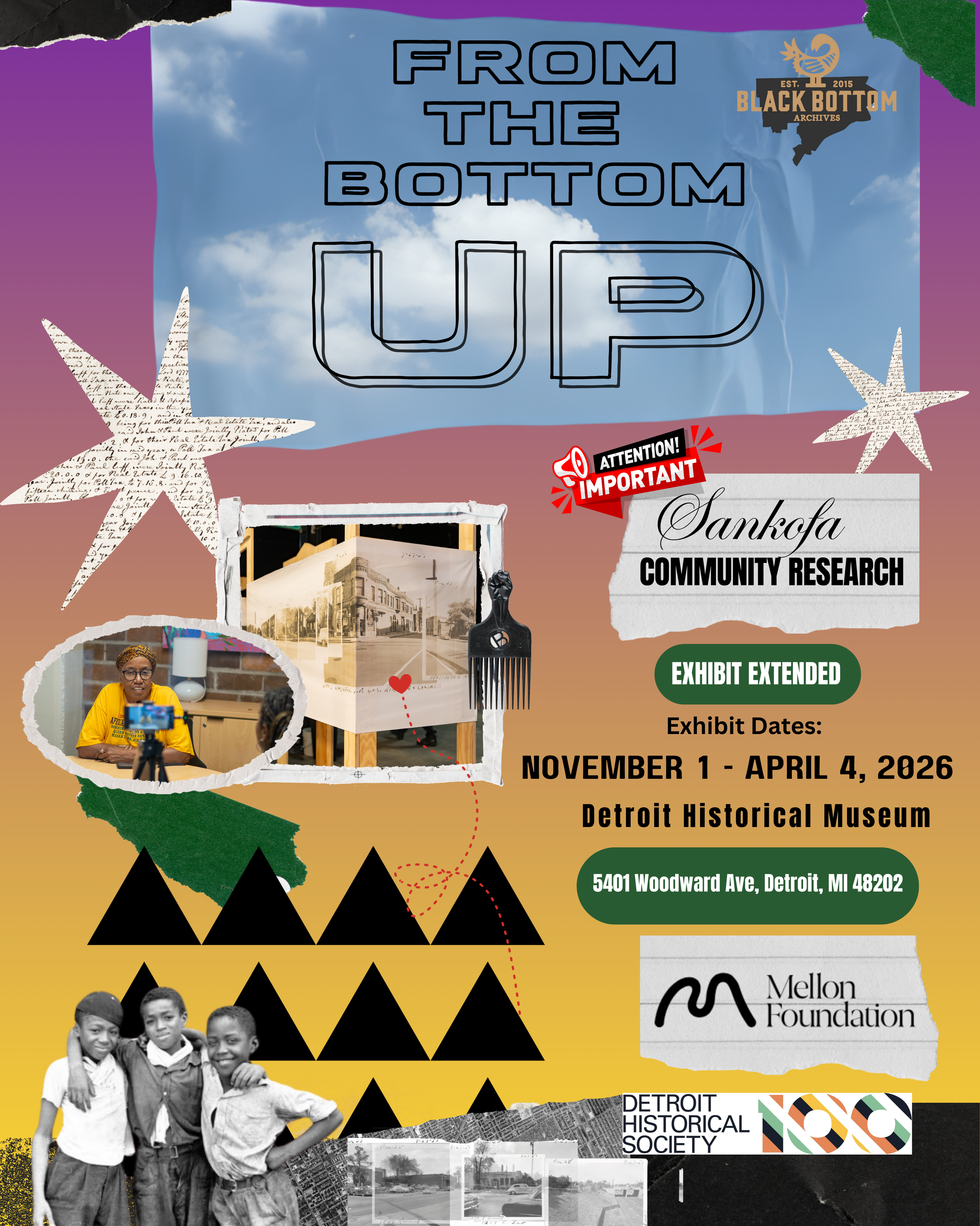 From the Bottom, Up presented by Black Bottom Archives, is a love letter to Black Bottom, the heartline of Black Detroit, written through memory, movement, and the voices of the community. Rooted in the West African adinkra principle Sankofa, meaning “go back and get it,” join us as we remember our past, reflect on its impacts on our present, and shape a better future for Black Detroit.