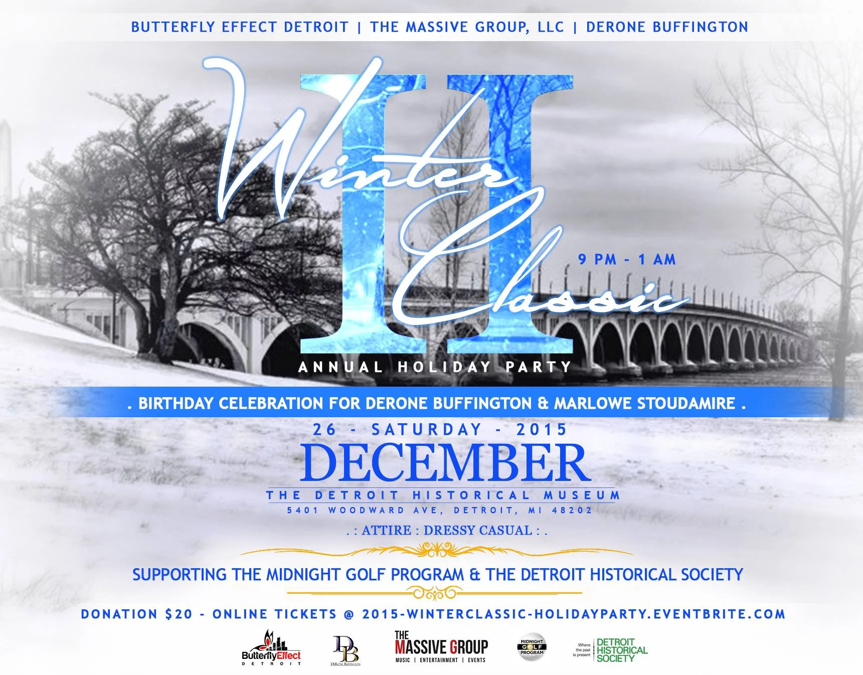 You are cordially invited to the 2nd Annual Winter Classic Holiday Party and birthday celebration for DeRone Buffington and Marlowe Stoudamire at the Detroit Historical Museum.