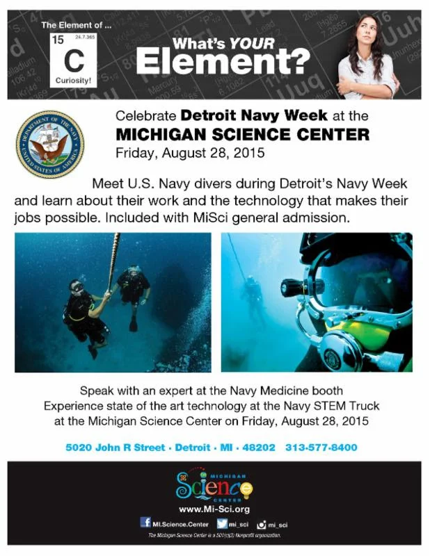 What's Your Element? | Detroit Navy Week Celebration Friday, August 28, 2015 11:00 AM 5:00 PM Michigan Science Center 5020 John R St Detroit, MI, 48202 United States (map) Google Calendar ICS