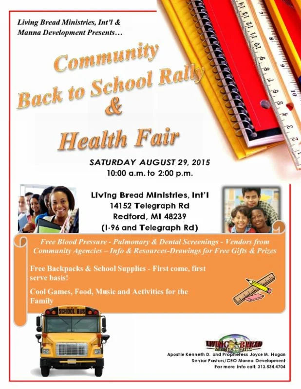 Community Back to School Rally & Health Fair Saturday, August 29, 2015 10:00 AM 2:00 PM Living Bread Ministries, International 14152 Telegraph Rd Redford Charter Township, MI, 48239 United States (map) Google Calendar ICS