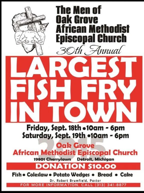 Oak Grove African Methodist Episcopal Church | 30th Annual Largest Fish Fry in Town Friday, September 18, 2015 10:00 AM Saturday, September 19, 2015 6:00 PM Oak Grove African Methodist Episcopal Church 19801 Cherrylawn St Detroit, MI, 48221 United States (map) Google Calendar ICS