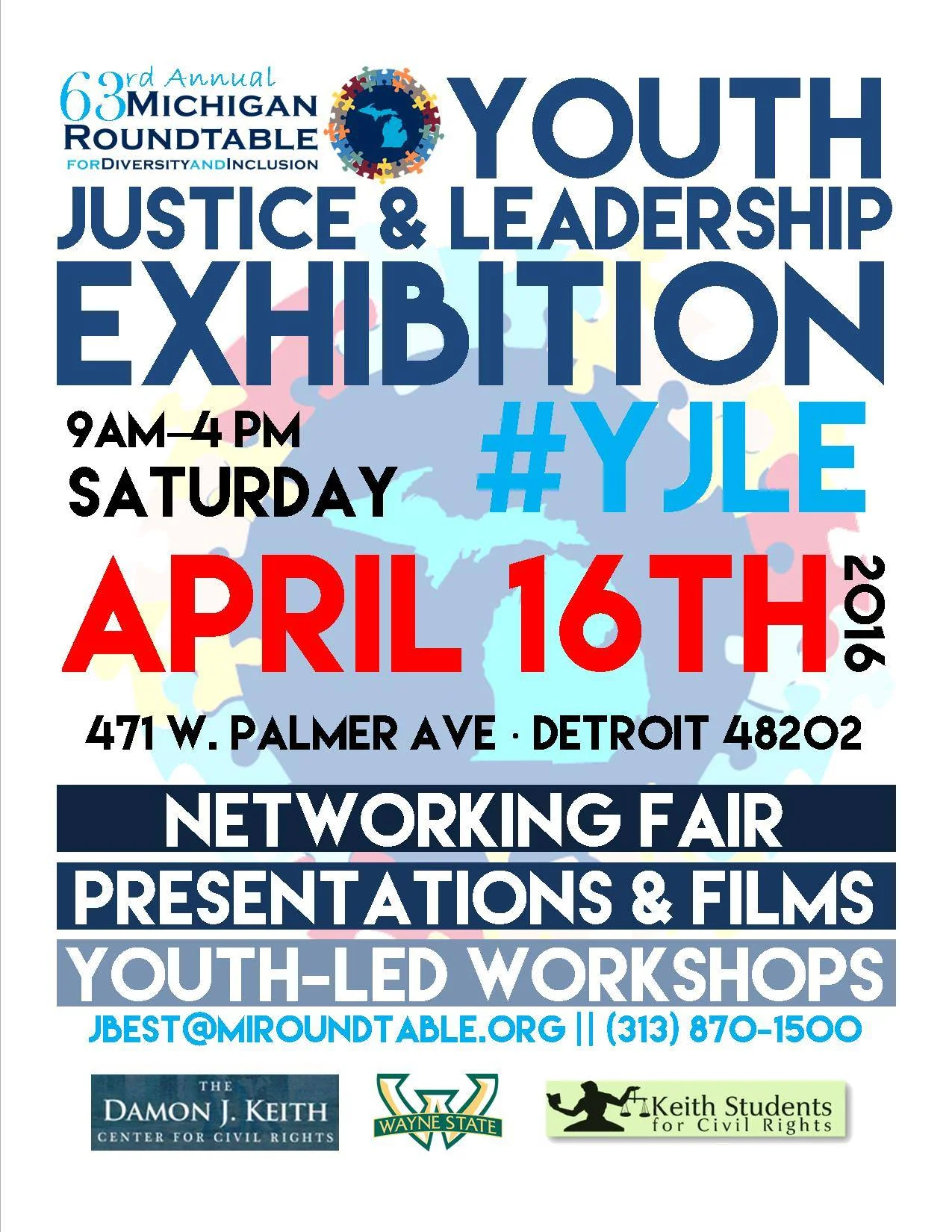 The 2016 Youth Justice & Leadership Exhibition (#YJLE) is a youth-led and youth-focused Exhibition for young people and their adult allies from Metro Detroit and the State of Michigan. The #YJLE empowers youth to advocate for social justice issues within their schools and communities and connects youth throughout Detroit, creating a collaborative space for youth to be both teachers and learners. Michigan Youth care about social inequities, are organizing around social issues, and work toward social justice. On April 16th, 2016, the Roundtable would like to celebrate, support, and honor all the hard work that has been happening this year! #MRDIYouth