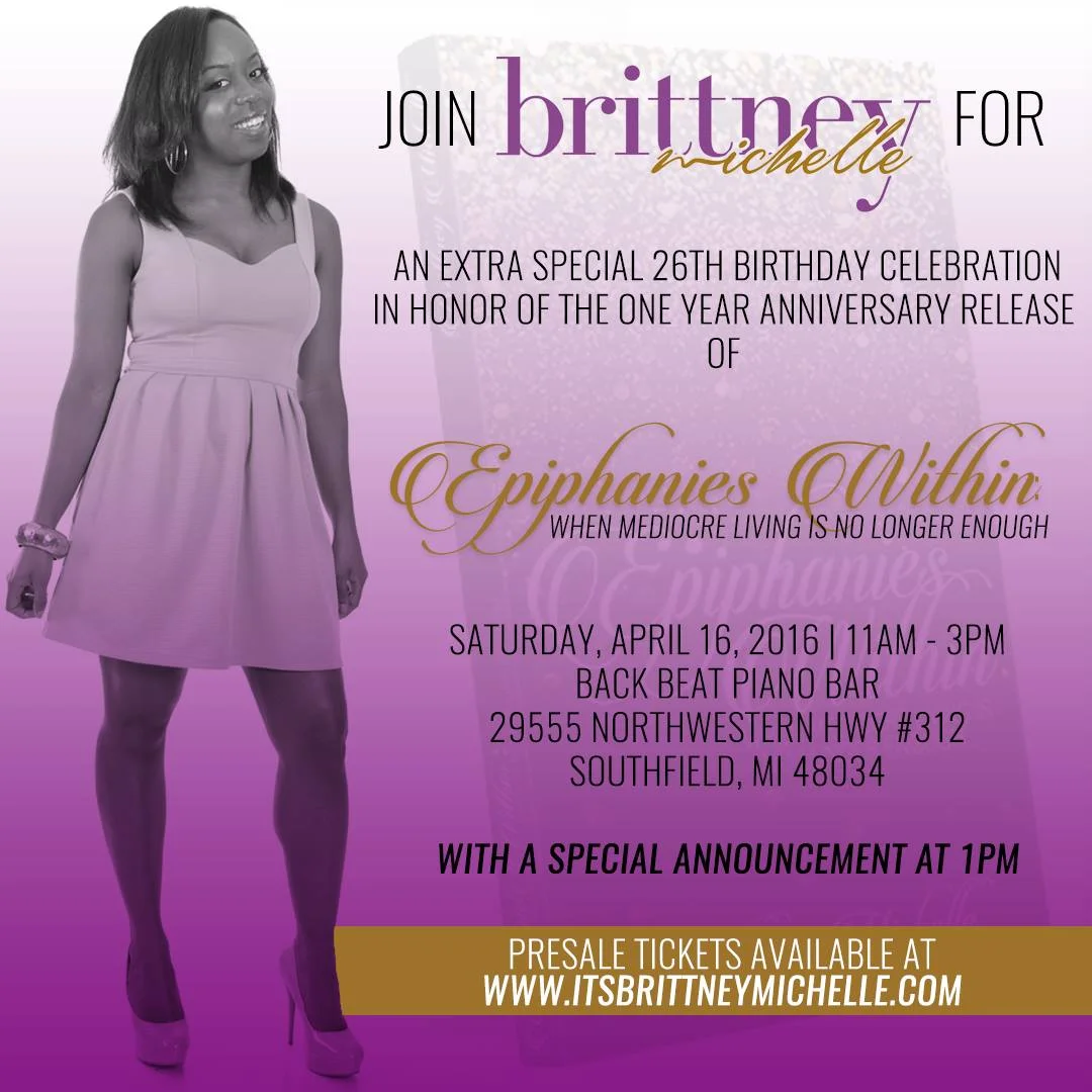 Join Brittney Michelle For An Extra Special 26th Birthday Celebration In Honor of the One Year Anniversary Release of her debut book: Epiphanies Within: When Mediocre Living is No Longer Enough.